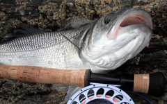 On the third cast I took my first fish. I land and release the fish and move slowly through the water crossing my ring finger without standing out of the water. Just beyond the left end of my middle finger is now my new target and this situation is one where I will fish most actively and as best I can. Its here that I expect to have real success. I fish for 15 minutes with no result and decide to check the knots – I begin reeling in the entire last cast when a fish hits, he is immediately on the reel and its a nice one too. Some walkers stop to watch the crazy man up to his elbows in the sea trying to land a fish, its always a mad time with a fly rod. This one runs to just under 3Kgs